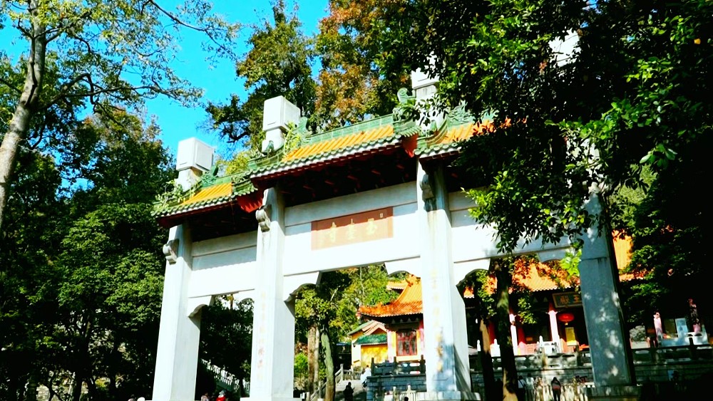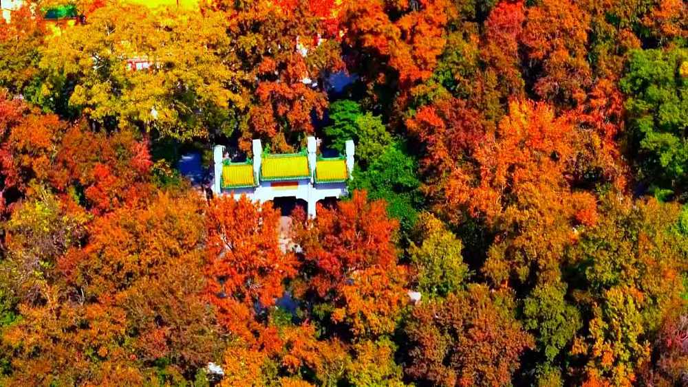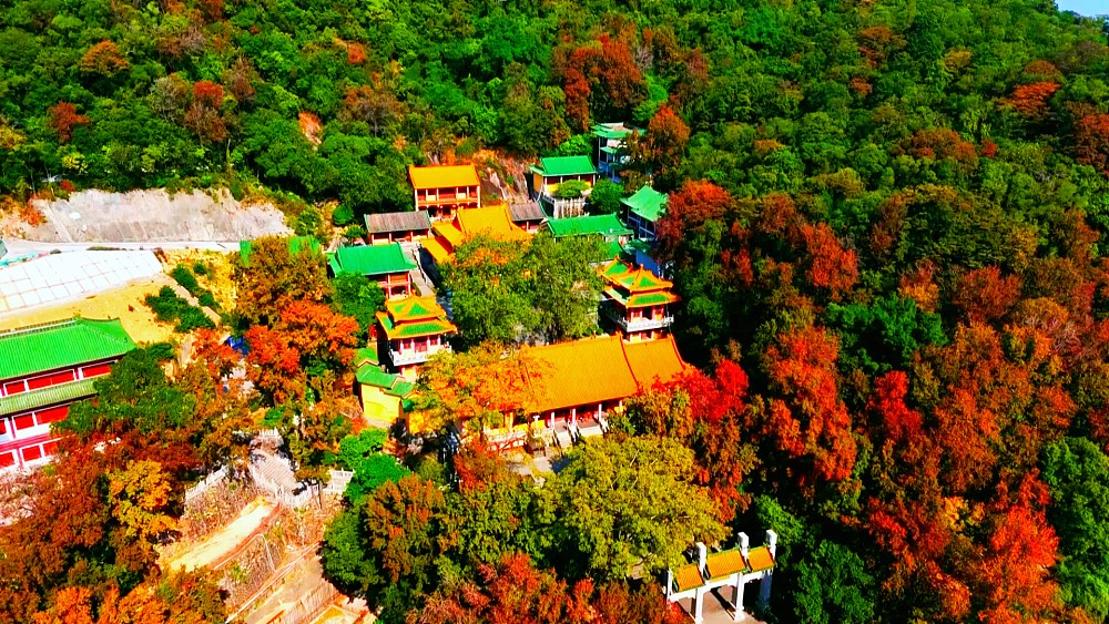 在午後陽光映照下,楓葉呈現紅、橙、黃三色漸變,與山頂玉臺寺的飛檐斗拱古典建築相映成趣,構成一幅充滿禪意與畫意的景象。