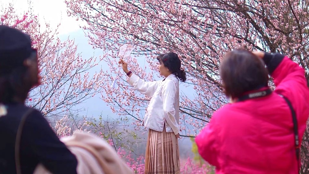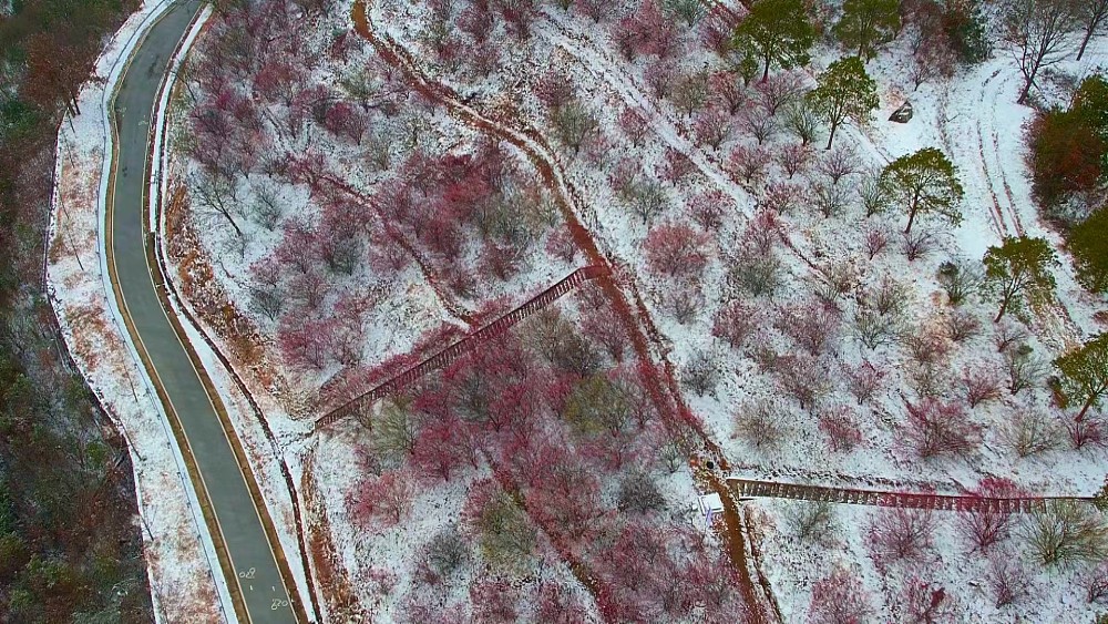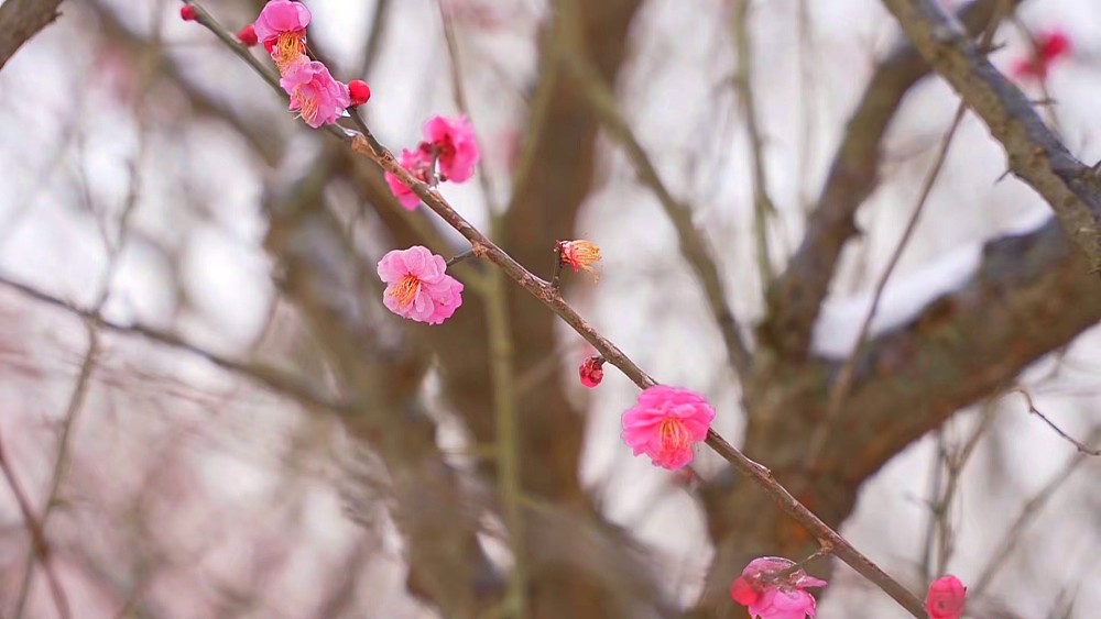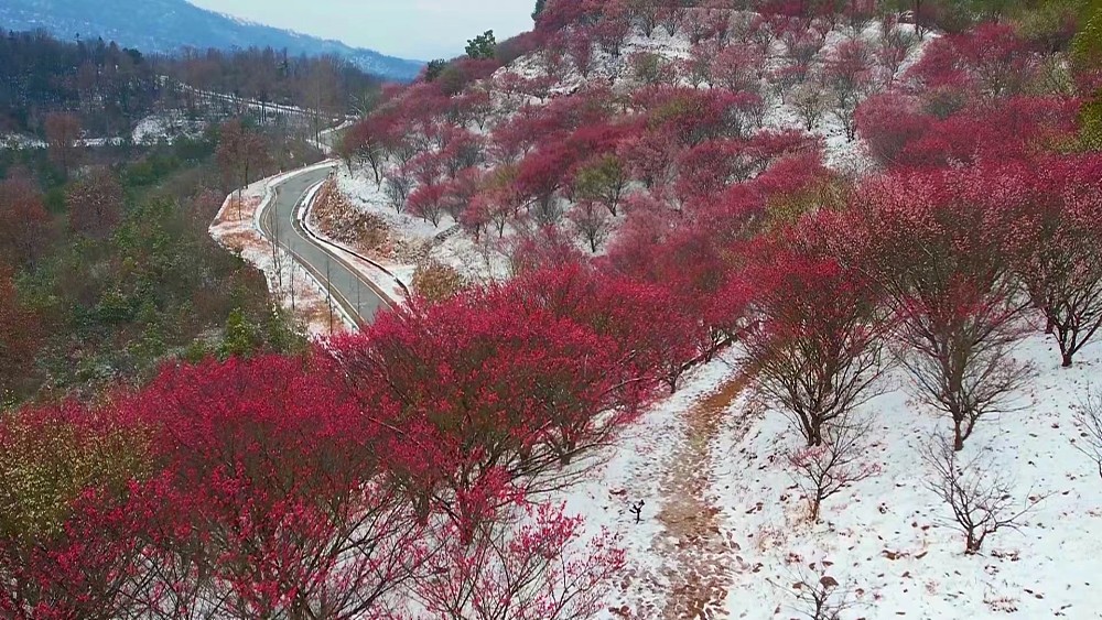 武漢風貌木蘭花谷市場銷售部總監譚迪說:「風貌木蘭花谷景區內近300畝梅花山種植有江梅、宮粉梅等數十個品種的梅樹,目前已綻放七成,近期將迎來盛花期。今年花期同比去年提早近一個月,此次盛開正逢武漢2026年初雪,雪落梅海,梅綻暗香,一點紅妝破素白,成為武漢冬日裡一道風景線。」