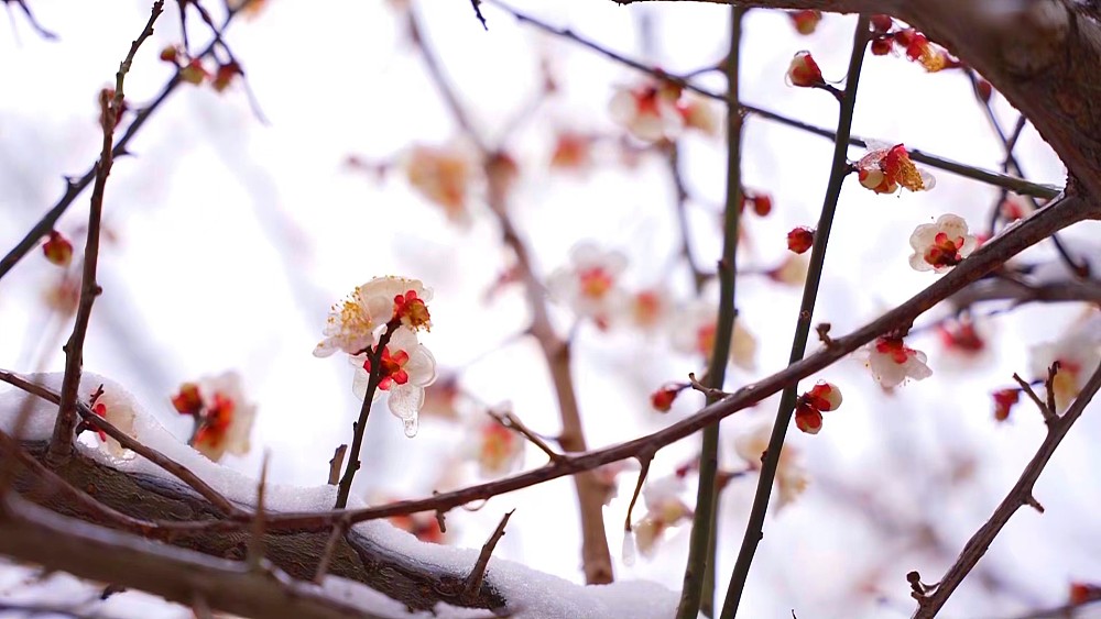 雪後園區積雪達5至10厘米,梅枝凝結冰淩,與粉白艷紅的花朵相映成趣。園內種植江梅、玉碟、宮粉等數十品種,雪壓花枝的景致打破傳統梅園的婉約,更添幾分野趣濃烈的氣息。