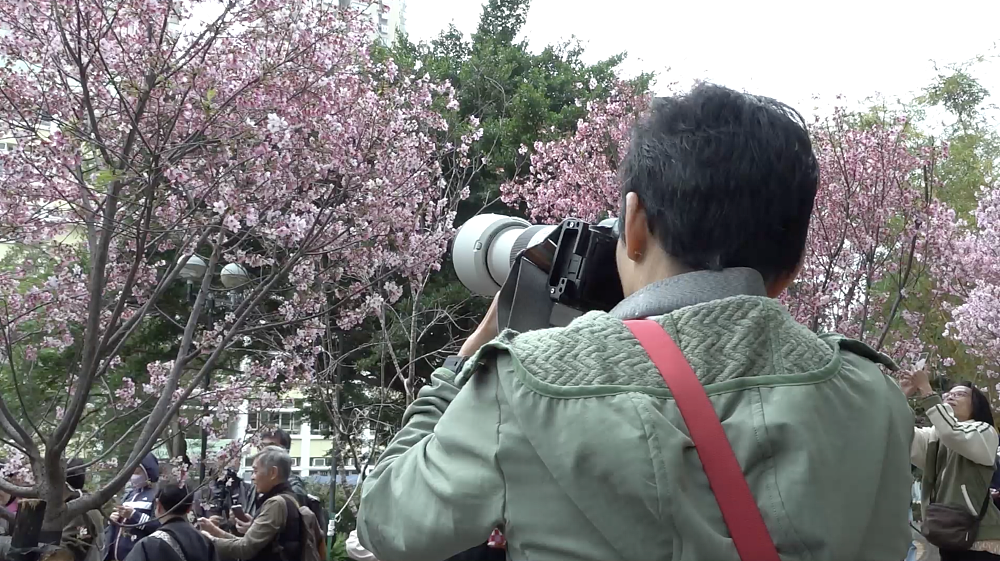 在一片粉紅色花海下,有「龍友」帶備「長槍短炮」,舉相機捕捉櫻花大特寫,有人則精心擺甫士拍照。