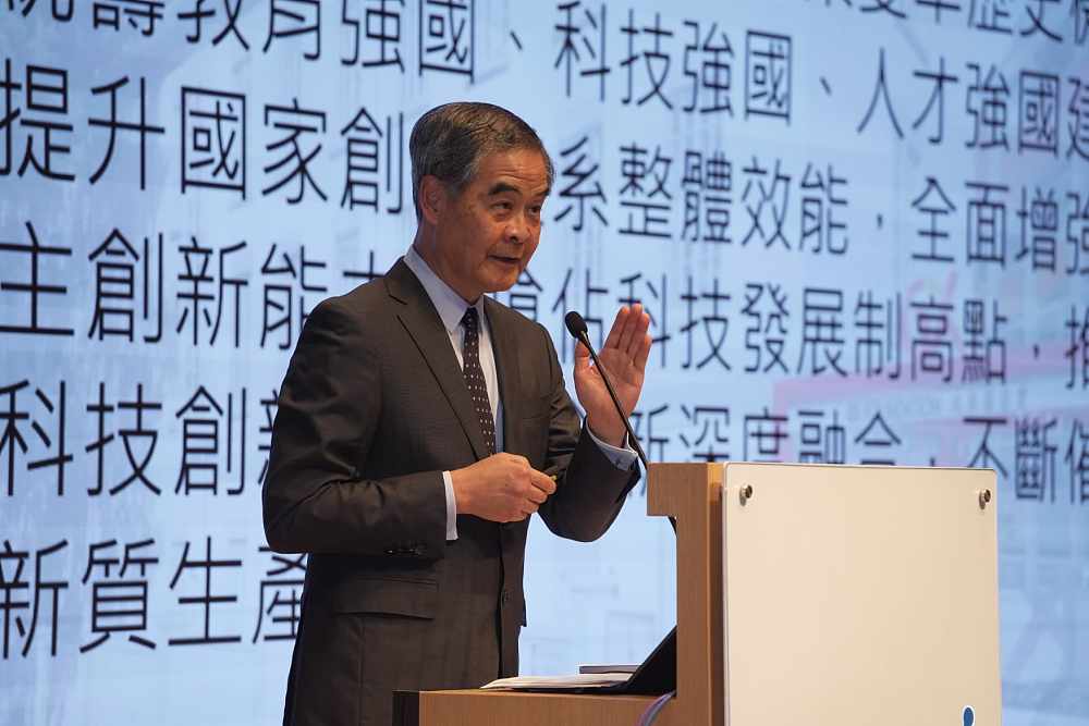 梁振英致辭時談到今年全國兩會與以往不同的是,今年正值「十五五」規劃開局之年,而在《政府工作報告》中提到「全面推進科技強國建設戰略部署,強化國家戰略科技力量建設,完善區域科技創新體系,加強基礎前沿領域體系化布局和關鍵核心技術攻關」。他指出《「十五五」規劃綱要》(下稱:《十五五綱要》)其中的重要性,是為我國在2049年前「全面建成社會主義現代化強國」而進發,為達成此目的,望在2035年前建成教育強國、科技強國、人才強國,並提到在京津冀、長三角、粵港澳大灣區建設國際科技創新中心。