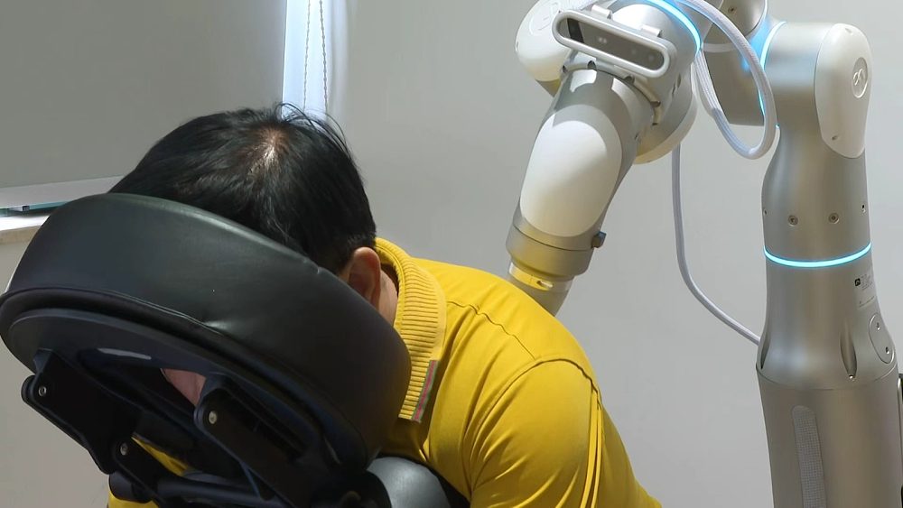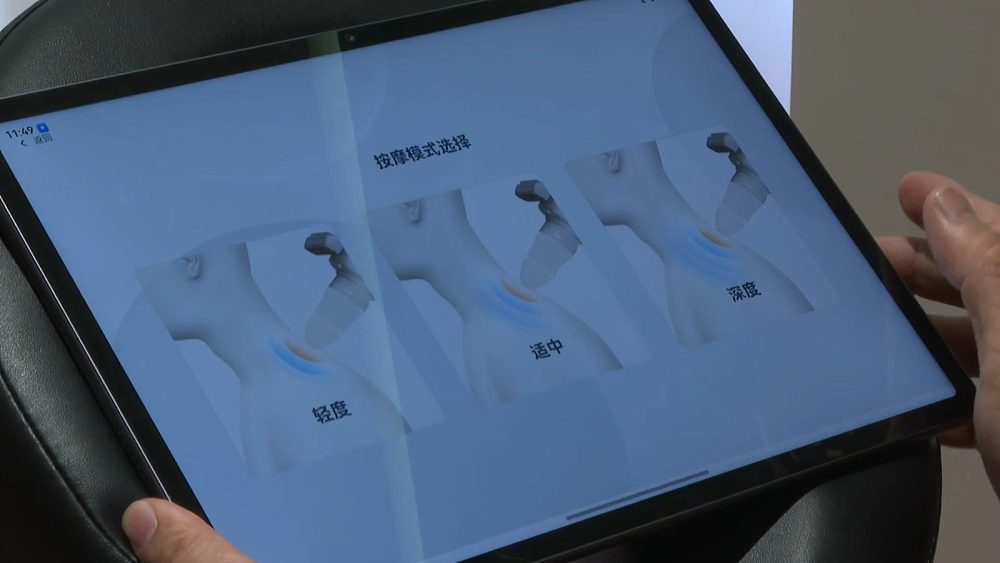 這位機械人「按摩師」外形設計酷似智能健身器材,頂部搭載高清攝像頭,前端配備操作平板,運行時全程有智能語音提醒,操作簡潔,適配各年齡段人群。它還可以根據使用者的性別、所選擇的按摩強度和按摩部位,自動調整七軸機器手臂的按摩手法和力度,提供定制化服務。