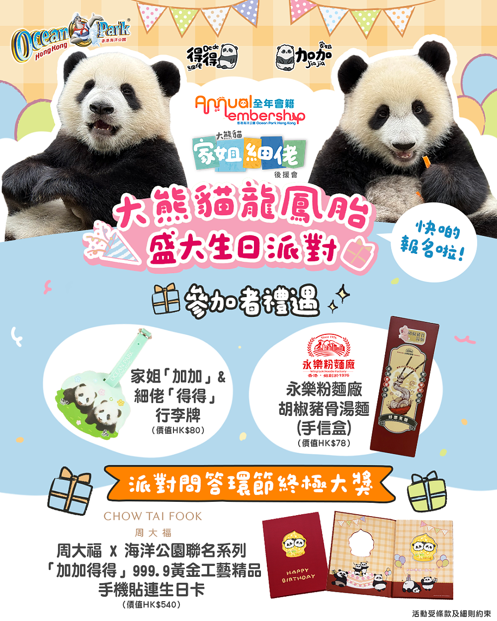 海洋公園將於8月15日舉辦「大熊貓龍鳳胎盛大生日派對」,參加者更有機會在「大熊貓之旅」專享獨家時段,探訪大熊貓「加加」、「得得」、媽媽「盈盈」和爸爸「樂樂」。園方招募20位與「加加」和「得得」同年同月同日、在香港出生的小朋友,與他們的家人參與一場溫馨的生日慶祝活動,讓香港最年幼的壽星們專享與大熊貓寶寶一起慶生的歷史性機會。成功參與的小朋友更有機會獲贈由海洋公園及贊助商送出的生日禮物包。