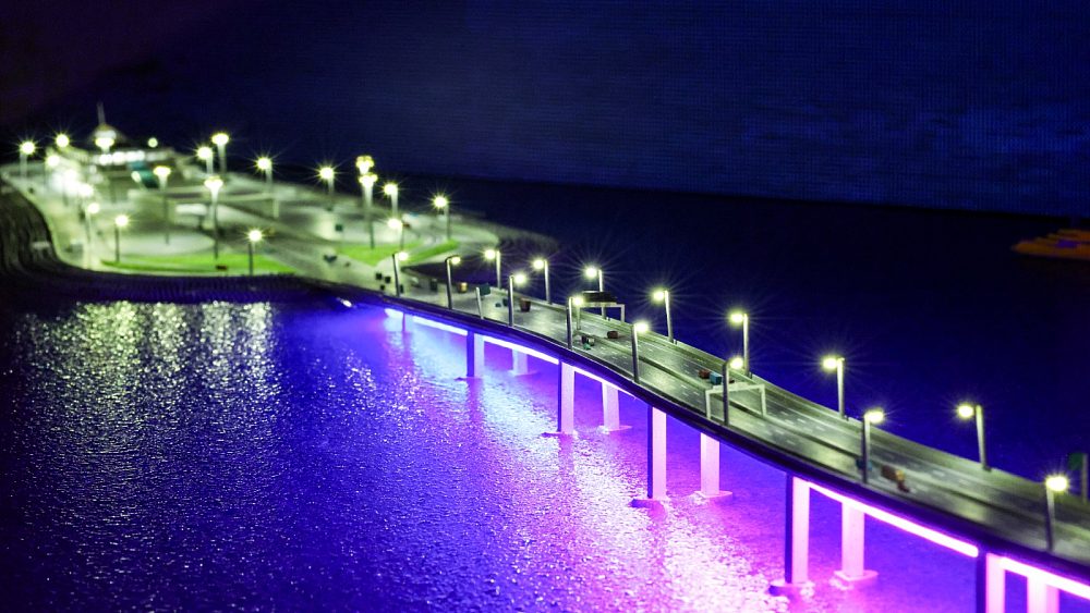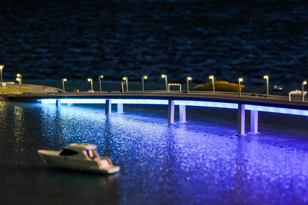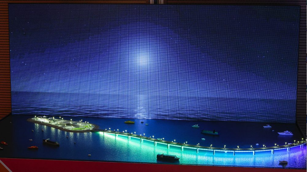 被譽為國家工程奇跡的港珠澳大橋,現為全世界最長的沉管隧道以及世界跨海距離最長的橋隧組合公路。它全長55公里,主橋全長約29.6公里,包括兩條分別長約6.7公里及5公里的海底隧道及3個人工島,促進粵港澳大灣區的發展。作品聚焦人工島和微彎的橋,在彩虹、流星雨、星夜和日落等醉人景致的變幻中,車和船在橋上橋下浪漫前行。