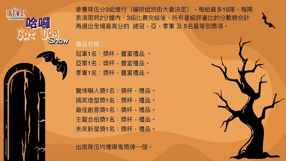 ⁃ 寵主和寵物需打扮迎合哈囉嘩⿁服飾,在指定參賽道上擺出⾃訂Pose讓評審團比分(可⽤能移走的道具)。