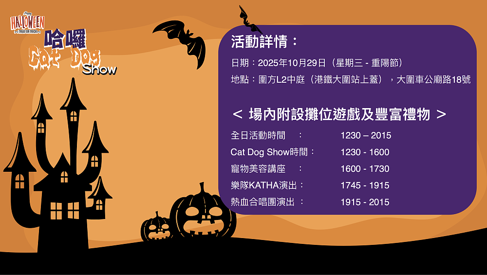 由香港學⽣活動基⾦會主辦,圈傳媒及閱江文化科技發展有限公司等媒體⽀持的「哈囉 Cat Dog Show」,將於10⽉29⽇在⼤圍⾞公廟路18號圍⽅L2中庭舉行,屆時設有萬聖節主題的寵物表演、寵物美容講座及攤位遊戲等精彩活動,著名藝⼈譚⽟瑛、KOL鄭伊娜、立法會議員黎棟國,以及沙⽥區議會委任議員潘國⼭等星級評審將出席,現場亦會送出豐富禮品,歡迎愛寵之⼈帶同⼼愛寵物⼀齊參與狂歡。