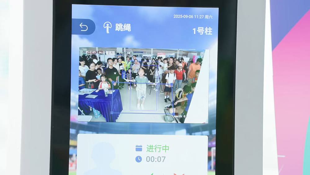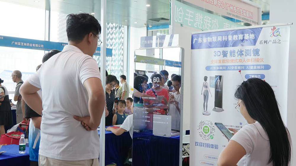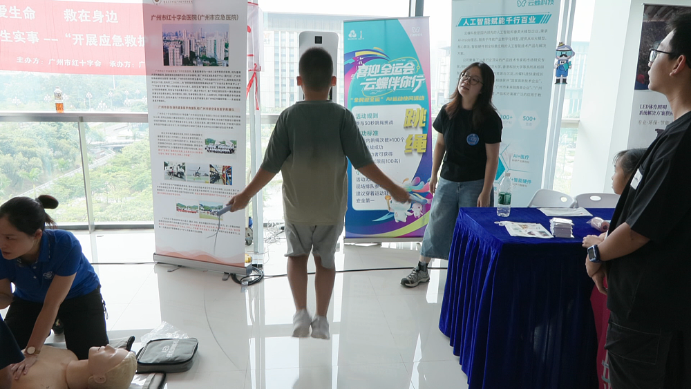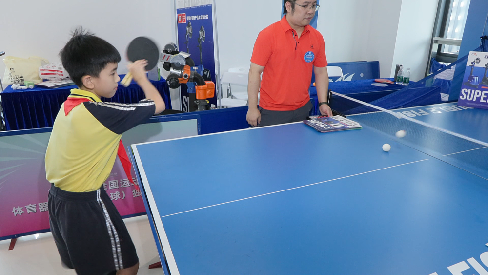 在廣州城市規劃展覽中心舉辦的廣州市首個全國科普月主場活動暨第八屆廣州科普嘉年華上,市民可體驗高科技融入體育、醫療、教育等多個領域,多個互動體驗區大排長龍,其中最受歡迎的是第十五屆全運會主題專區,市民可以試玩「AI體測柱+跳繩」裝置,或者借助「超級發球機」練習乒乓球。體育研究院工程人員陳兆倫說:「有一個防卡球的發明專利,這款發球機,無論你是剛入門的,還是業餘選手,或者是打得比較好的,想提高自己的訓練(水平),都可以用這款發球機。」