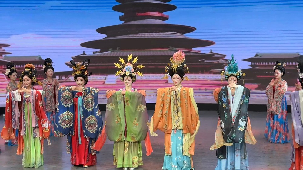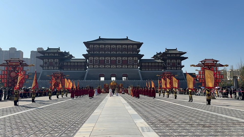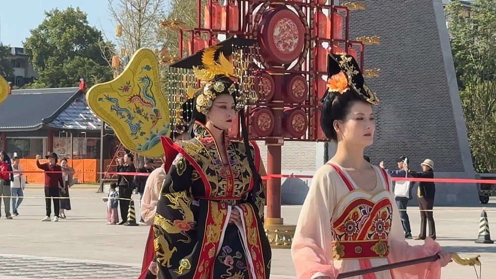 應天門北廣場上演跨越千年的《武皇登基》大典,最近改為常態化演出。金甲衛隊旌旗開道,女皇「武則天」身穿華麗袞服,接受百官朝拜,完整重現唐代登基盛況,現場驚嘆連連。為呈現精準的歷史敘事,導演團隊邀請唐史學者指導並深入研究,從武則天冕服的金線刺繡紋樣,到文武百官的站位,均參照《唐六典》《通典》記載設計。